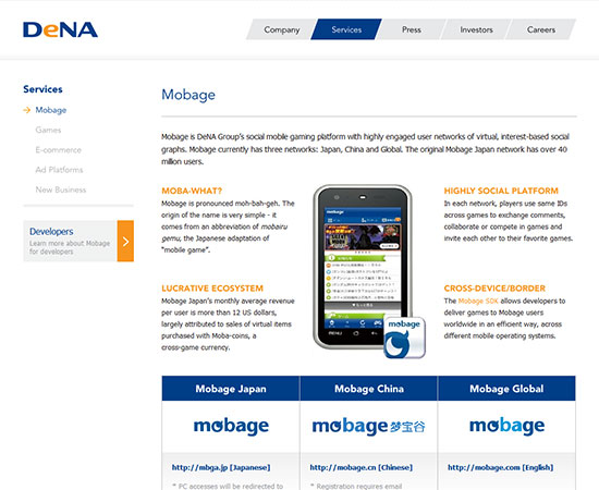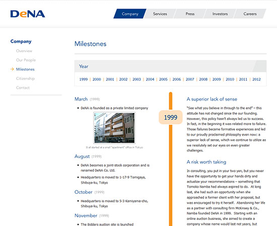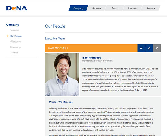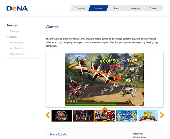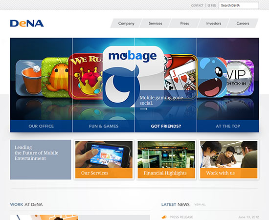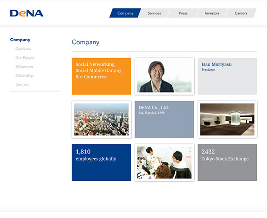 DeNA is internet company started in Japan that revolves around social & mobile gaming, e-commerce and web services for mobile devices. My role was to design a clean and modern corporate website for the US Market that reflected their existing brand.