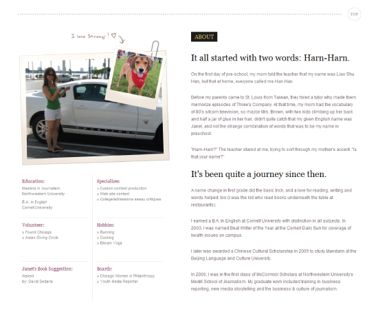 Janet Liao is a freelance writer, editor and media specialist based in Chicago (also my sister ^_^). This is her website to showcase some of her writing and work.