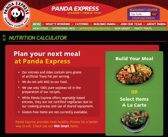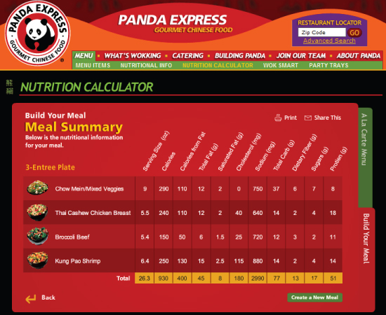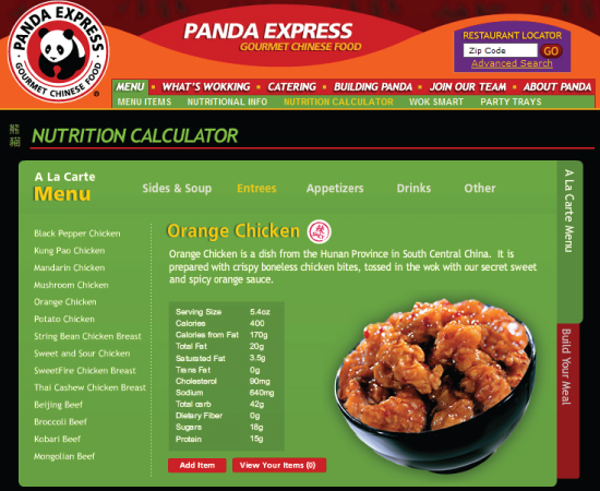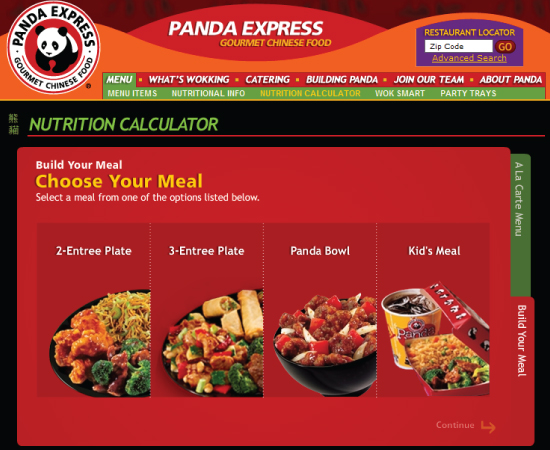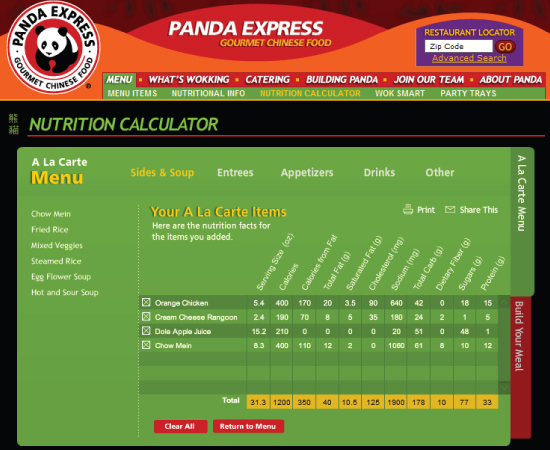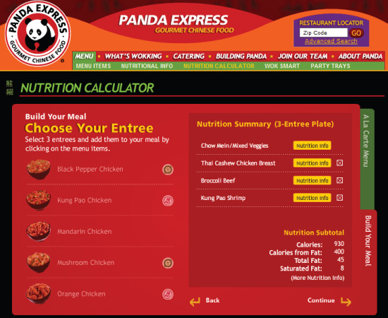 Panda Express is the largest chain serving Chinese fast food in the United States. I was responsible for planning, designing and developing a nutrition calculator that allowed their customers to calculate the nutritional values of their meal in two ways. People could build their meal by creating their combinations just like they would at the restaurant or choose items a la carte and add it to their tray. I developed this in Flash and designed a backend CMS so they could easily update or add new menu items.
